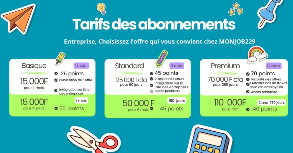 Les offres d’abonnements MONJOB229 (Basique, Standard, Premium) proposent des formules adaptées aux besoins des entreprises en termes de visibilité et de points pour publier des offres d’emploi. Chaque pack inclut des options sur 2 ou 6 mois, avec un crédit de points croissant et des avantages spécifiques pour booster le recrutement.