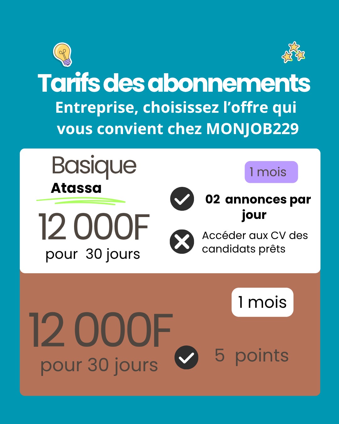 Abonnement pour entreprise, profitez du Pack basique ATASSA de Mon Job229 valable 30 jours avec la possibilité de poster 2 annonces par jour, d’avoir un accès direct aux CV des candidats et leurs scores.